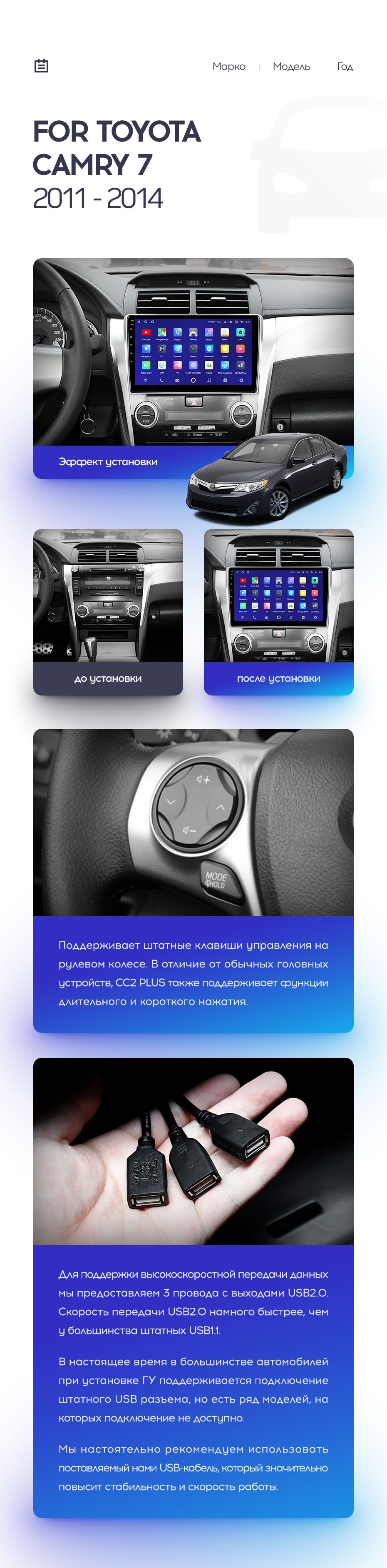Полный комплект установки магнитолы Teyes с рамкой и проводкой можно выбрать в каталоге штатных магнитол Toyota Camry 7 XV 50 55 (2011-2014).