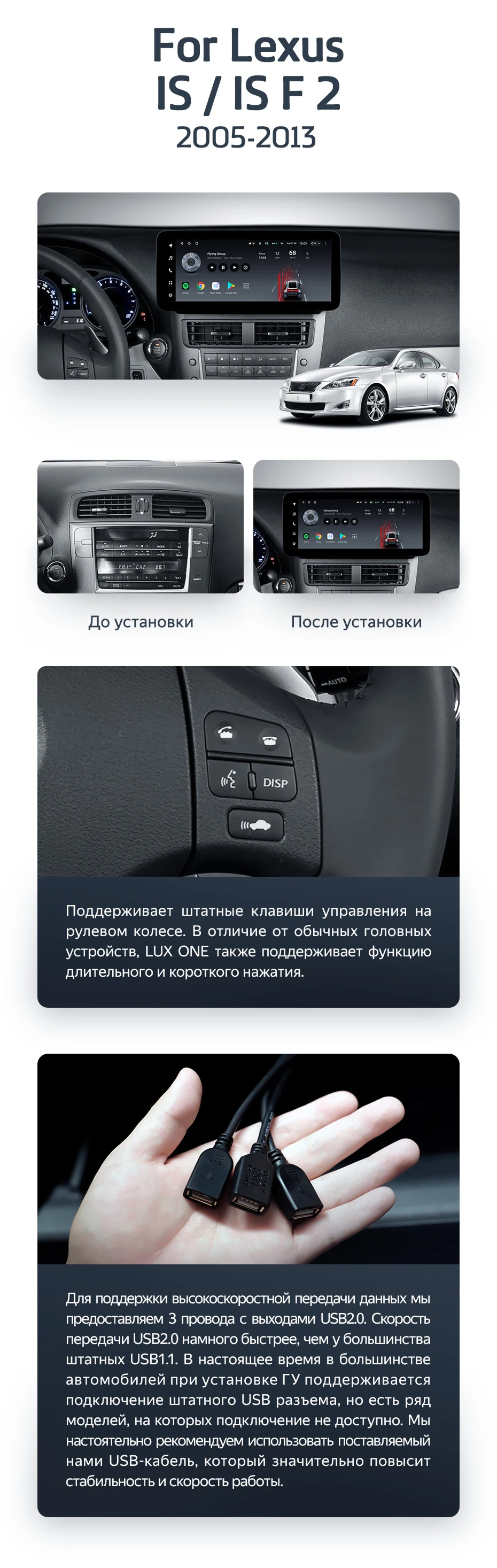 Готовый установочный комплект для магнитолы Lexus IS F 200D 220D 250 250C 300 350 350C 2 XE20 (2005-2013) 12,3 дюйма в штатное место, включает переходную рамку и проводку.